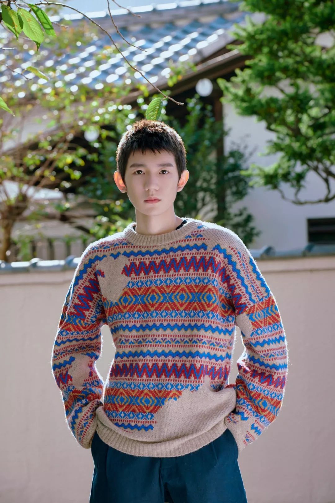 民族风图案的毛衣多颜色多种,线条图案较杂,很多人觉得民族风毛衣穿不好搭配不好就会变得土气,看李易峰这款,棕色黄色绿色米色通通上阵,圆领接下来的设计一圈一圈的接下来是典型的民族风毛衣风格,既有特色,又帅气得体。